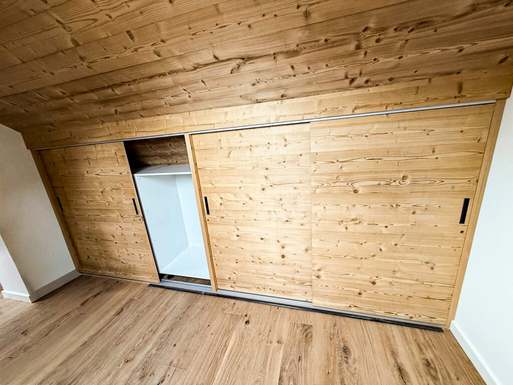 Dans une chambre mansardée, nous avons conçu un placard intégré sous pente. Le principal défi était de suivre la forme du toit, sans perdre de volume utile. Nous avons utilisé un épicéa vapo brossé, un bois haut de gamme, à la fois robuste et chaleureux. Sa texture naturelle et ses teintes douces s’intègrent parfaitement à l’ambiance montagne.
